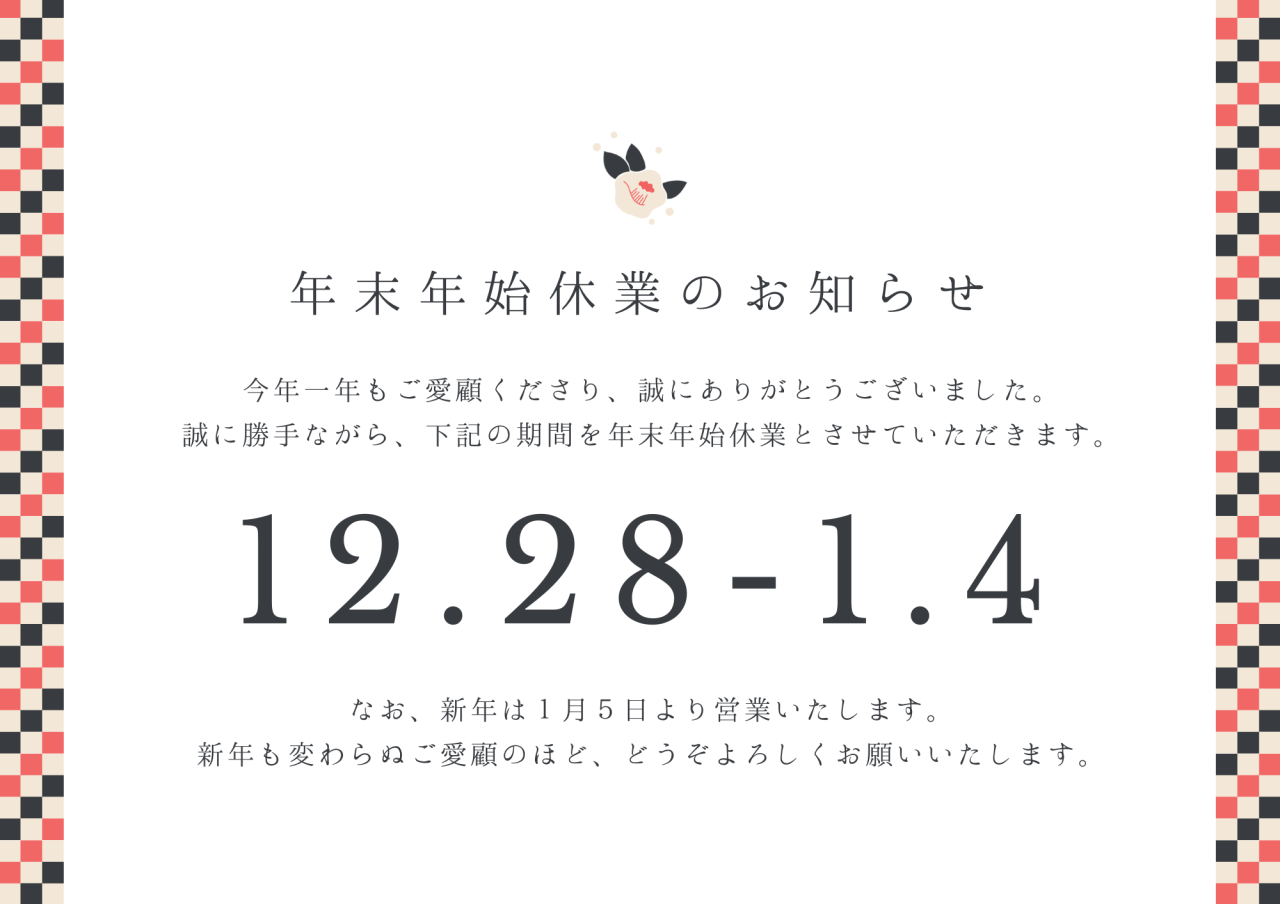 休業期間中のお問い合わせにつきましては、通常営業再開後の1月5日(月)より