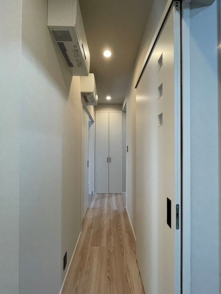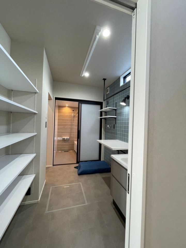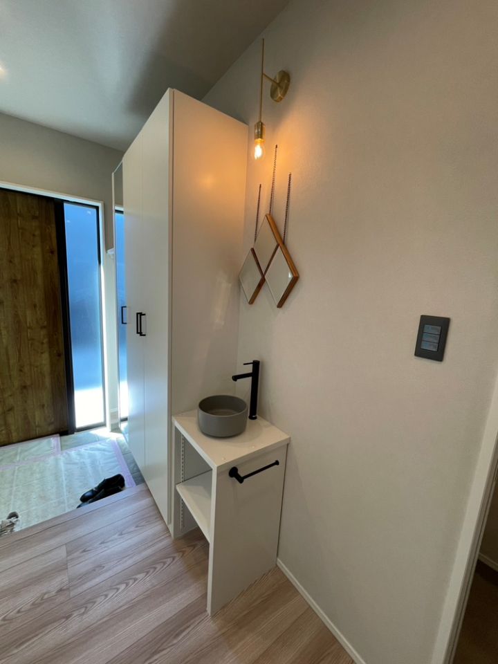 - 玄関を入るとすぐに手洗い場を設け、帰宅後の動きが自然につながる間取りに。毎日の暮らしを想定した、使いやすい動線計画が住まい全体に行き渡っています。