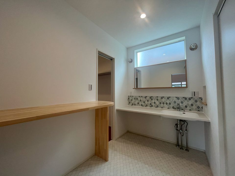 - 造作ならではの自由度を活かした独立洗面台は、大きな鏡と、お施主様こだわりのモザイクスタイルが一際目を惹きます。広々とした設計で、毎朝の支度もスムーズに。