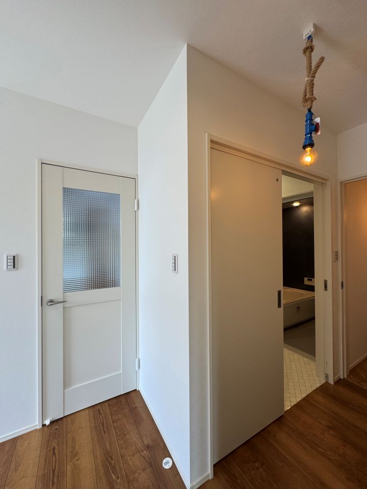 - 照明にも特別な思い入れのあるお施主様。施主支給の照明はLDKのアイキャッチとして空間を一層彩っています。また、トイレ・脱衣所入り口の照明も水栓をモチーフにした特徴的なデザインで、インテリアのアクセントになっています。