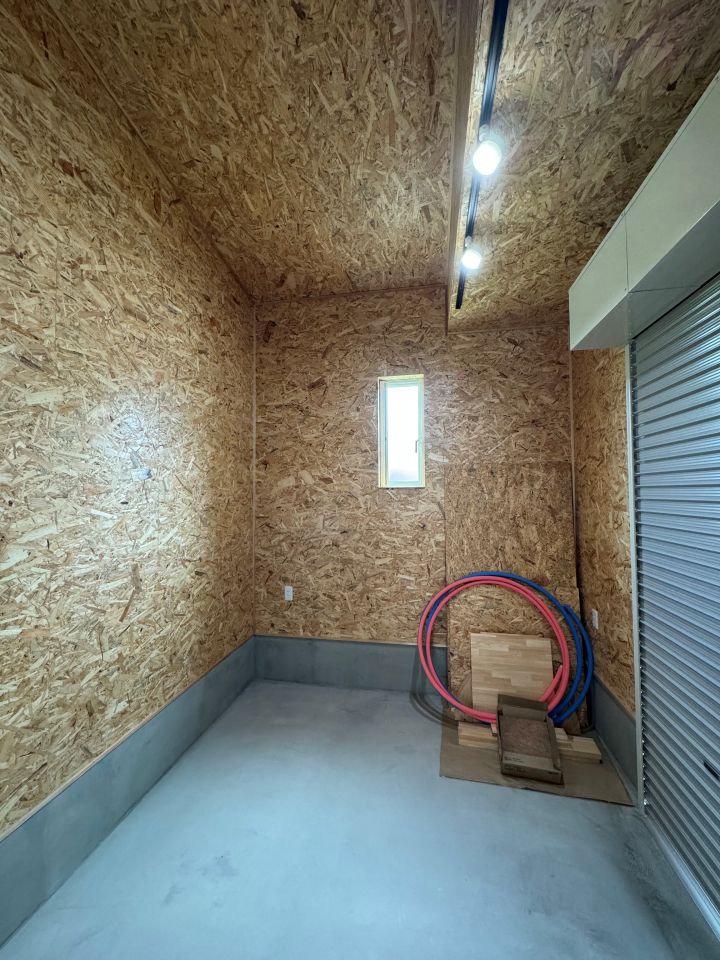 - サーフィンがご趣味のS様。サーフボードを収納できるインナーガレージを設置されました。壁はベニヤ板の質感をそのままに、ラフでカッコいい雰囲気をプラスしました。
